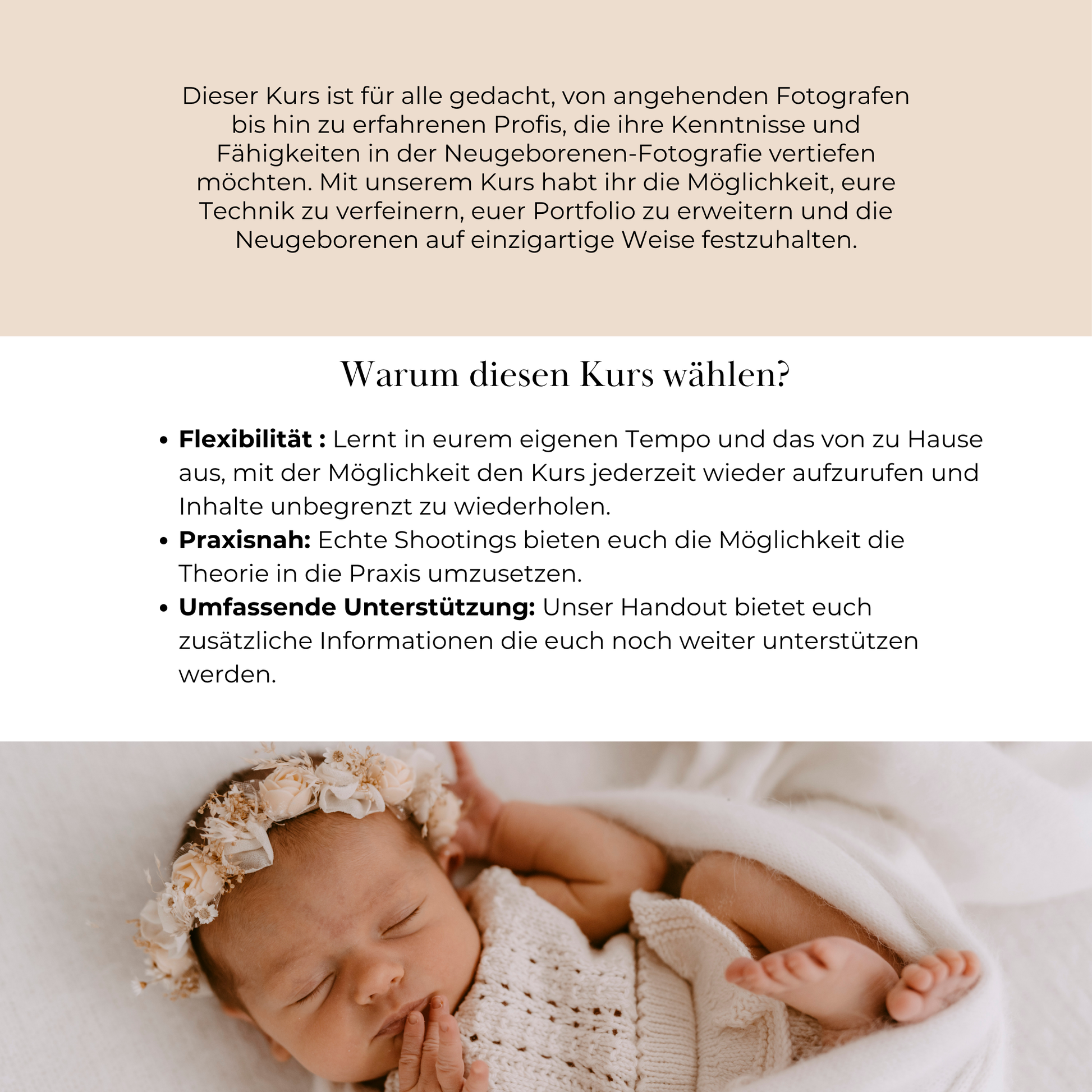Erhalte einen exklusiven Einblick in zwei echte Kundenshootings, die nicht gestellt sind, und lerne vielseitige Einwickeltechniken kennen. Du erfährst, wie du Babys sicher und kreativ für die perfekte Aufnahme positionierst und wie du in schwierigen Situationen souverän reagierst – mit wertvollen Tipps von Julia. Zusätzlich bekommst du ein 15-seitiges Handout mit praktischen Anleitungen und Shopempfehlungen, das dich optimal auf deinem Weg unterstützt. Nutze diese Chance, um deine Neugeborenen-Fotografie auf ein neues Level zu bringen!